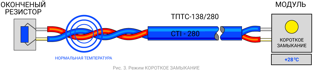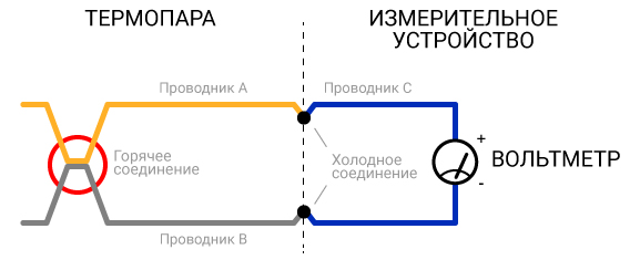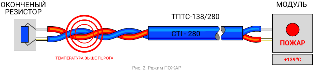 Когда два соединения проводников горячее, в защищаемой зоне, и холодное, в интерфейсном модуле, находятся под воздействием различных температур, возникает разность потенциалов, соответствующая разности температур. Посредством измерения термо-ЭДС определяется температура в точке замыкания проводников термокабеля (рис. 1).